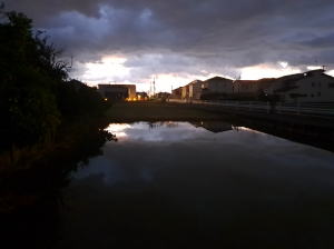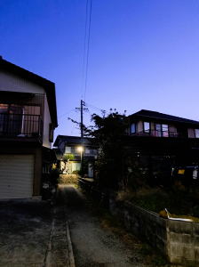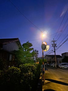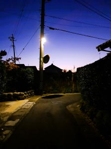 今朝の散歩の様子。まだ暗く街灯が眩しい。街灯を見つけては写真を撮りました。最後のは、現代の街灯。これがいちばん明るかった。