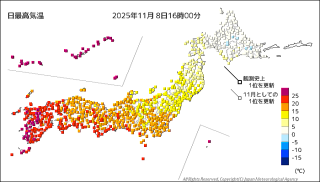 今朝の散歩、冷たい北風がふいて、冷え込みが厳しかった。この散歩以外はどこにも出かけず、引きこもりの一日とした。今日の午後4時時点の最高気温の色分布、綺麗に色別れしている。