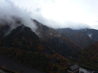 今年最後の三連休も終わり、今日から年末のお休みまでお仕事モードが続く。今週は、最終週の恒例の遠方出張の予定。まず、今日は北陸出張のために、6時半に出発。曇り空だったが、最初の営業目的地に着くころから雨が降ってきた。お昼には本降りで、とっても寒かった。岐阜市でも、今日の最高気温が12.2度だったそうだ。陽射しはなく冷たい雨となった。まだ明るいうちに帰路につくことができ、徳山ダムに道草した。ここでは、まだ雨が強く降っていたが。山にガスがかかり綺麗だったのでカメラを向けた。ここから下り坂を走って揖斐川町の市街地に着くころには、青空も見えて雨はやんでいた。