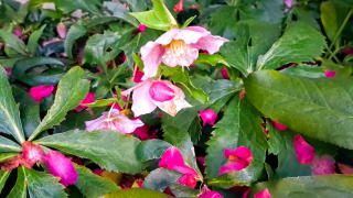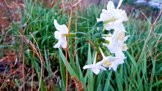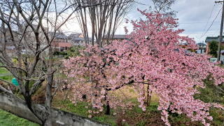 いつもの矩形の空。満開の緋寒桜。北風にも凛とさく水仙。クリスマスローズの花がたくさん咲いている。まだまだ蕾が小さな桜の枝。